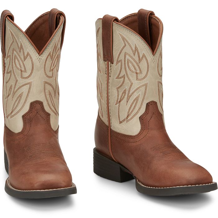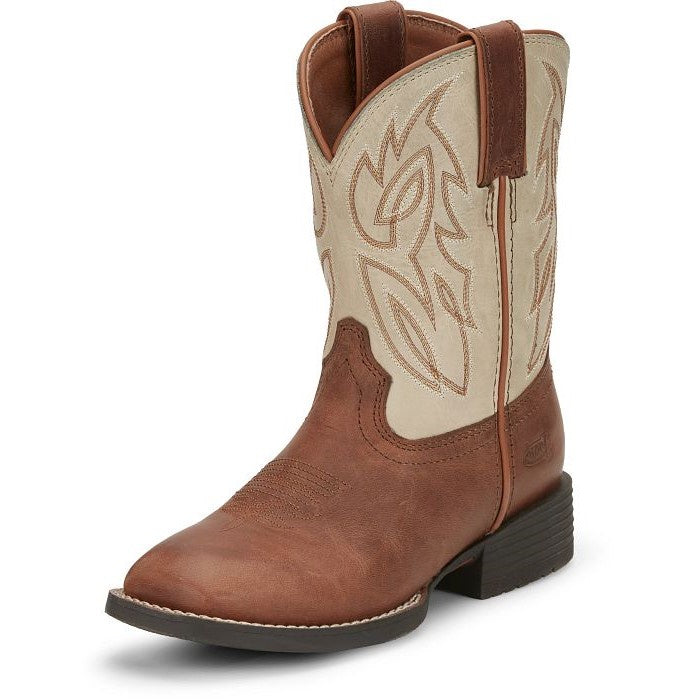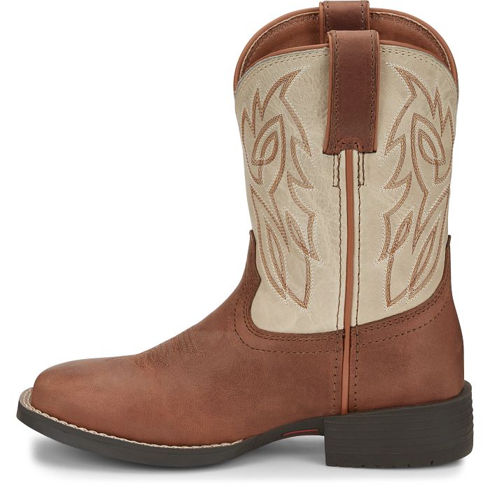 Crafted for young adventurers, these boots feature a durable brown leather exterior with intricate red and white stitching, adding a touch of Western flair. The easy pull-on design ensures a snug fit, making them perfect for active kids on the go. With a sturdy rubber sole for reliable traction, these boots are built to withstand every playful adventure, providing both comfort and durability. Perfect for everyday wear, the Cantor Junior Kids Boots are a must-have for any little cowboy or cowgirl.