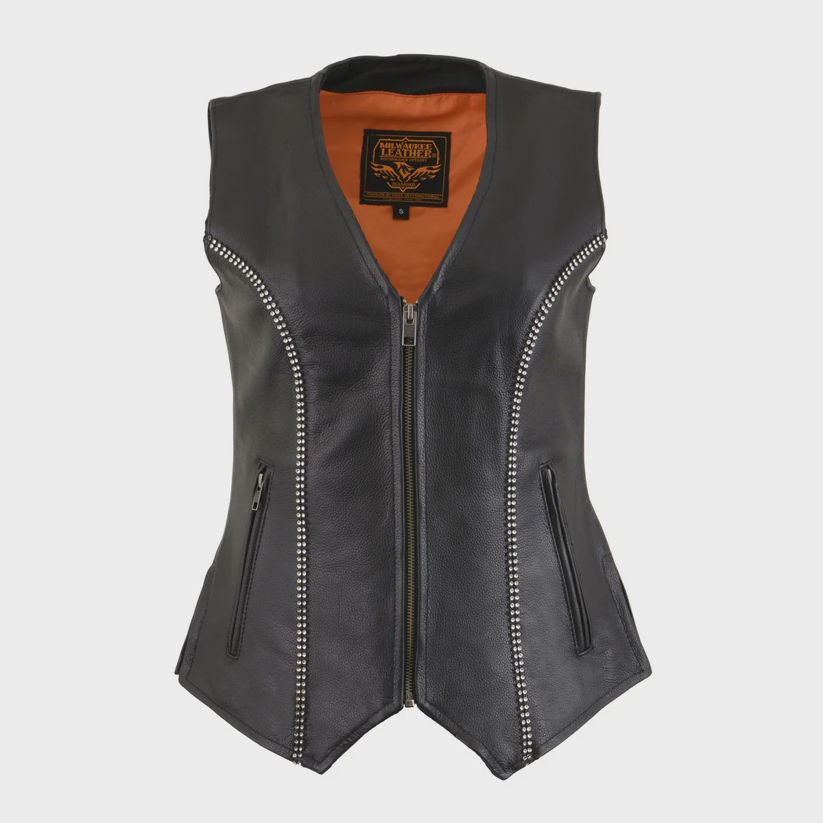 MILWAUKEE LEATHER - WOMEN'S BLACK LEATHER CLASSIC V-NECK MOTORCYCLE RIDER VEST WITH RHINESTONE BLING DETAIL - MLL4502